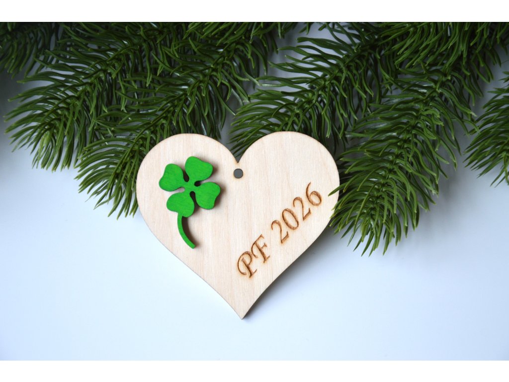 Dřevěné srdíčko se zeleným čtyřlístkem PF 2026. Srdíčko má dírku na šňůrku a lze ho tak zavěsit třeba na vánoční stromeček nebo kamkoliv jako dekoraci.
